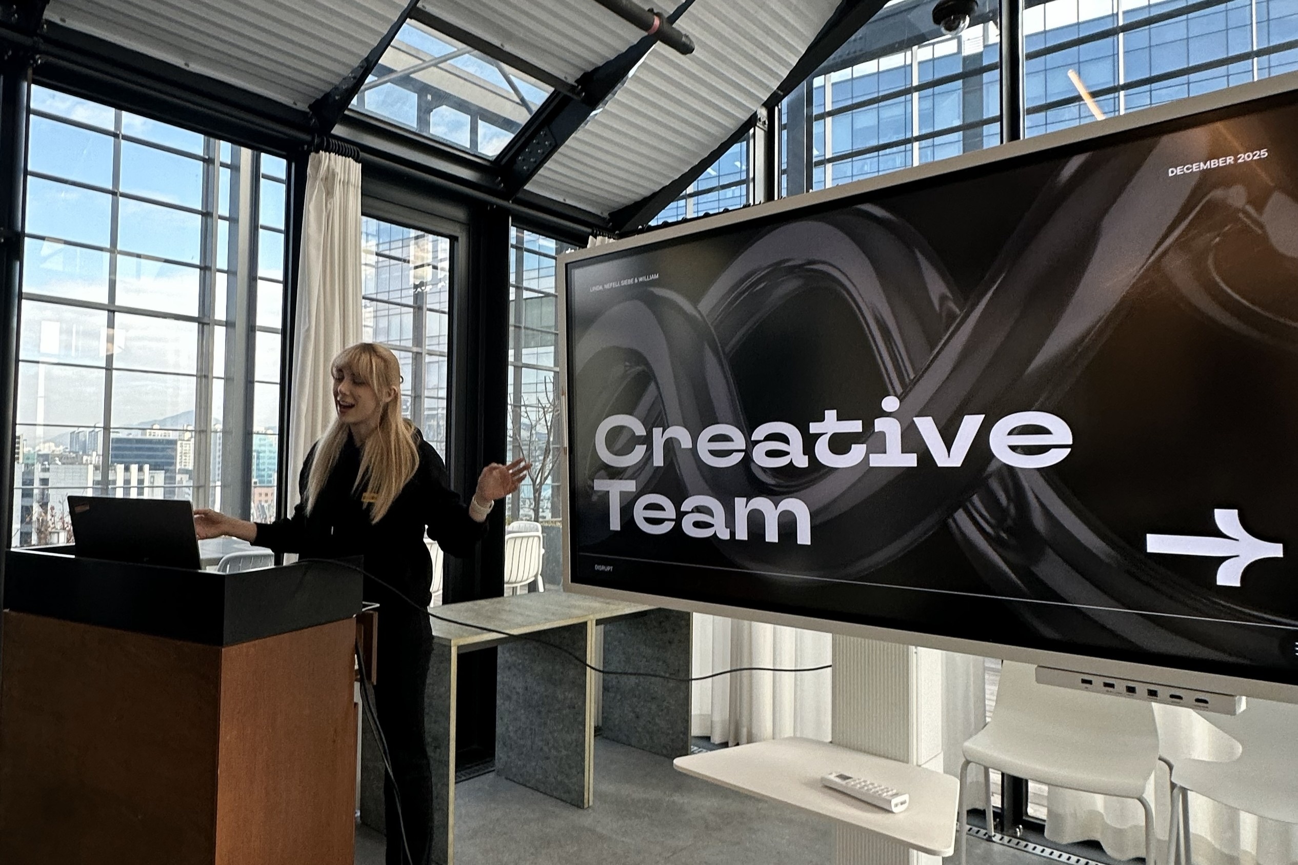 The afternoon sessions brought together two core elements of Disrupt’s identity: AI and creativity. Our first mission challenged teams to create a promotional video for Disrupt using AI tools. Beyond technical execution, teams were encouraged to reflect on how Disrupt’s values and culture could be expressed creatively. Despite the limited time, the results were imaginative, insightful, and genuinely fun to watch.